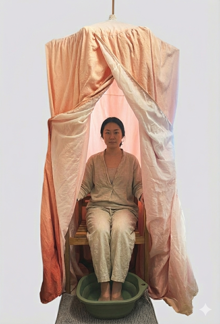 当店では、よもぎ蒸しのマントをかぶる方法ではなく、タイのハーブテントと同じスタイルでご用意させていただきます。スマホや本を読みながらということはできませんが、デジタルデトックスの時間として、テントの中で自分と向き合ったり、瞑想の時間にお使いいただければと思います。